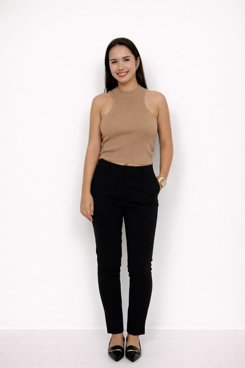 Débarder coupe ajustée confectionné dans une maille côtelée extensible. Col montant près du cou. Emmanchure américaines mettant en valeur les épaules. Finition droite. Taille unique - convient du S au L.